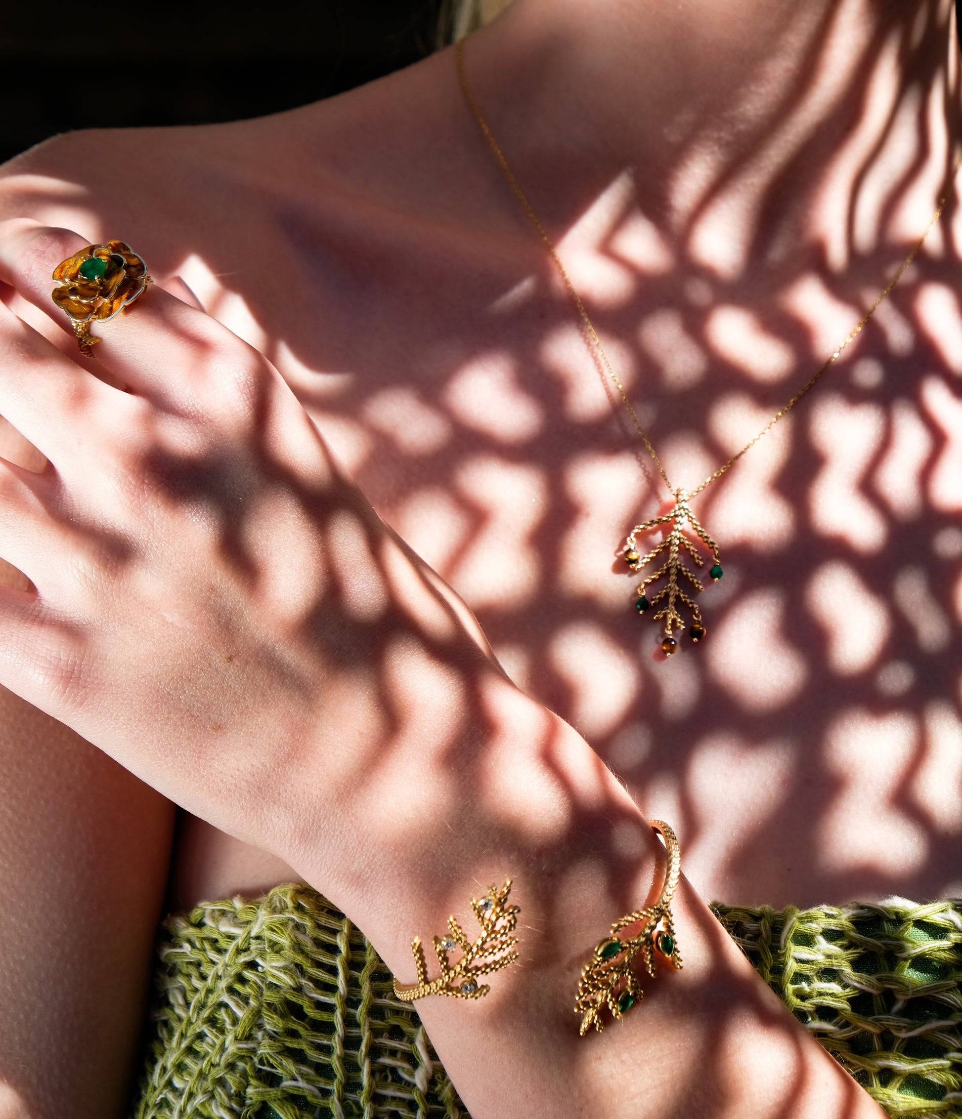Inspired by the irregular heads of spreading branches, this bangle is carefully shaped in the likeness of the Cedar's intricate forms. Adorned with white diamonds, reminiscent of cedars in the snow, and green emeralds, evoking the lush foliage of spring and summer, it captures the natural splendor of the Cedar's changing seasns.