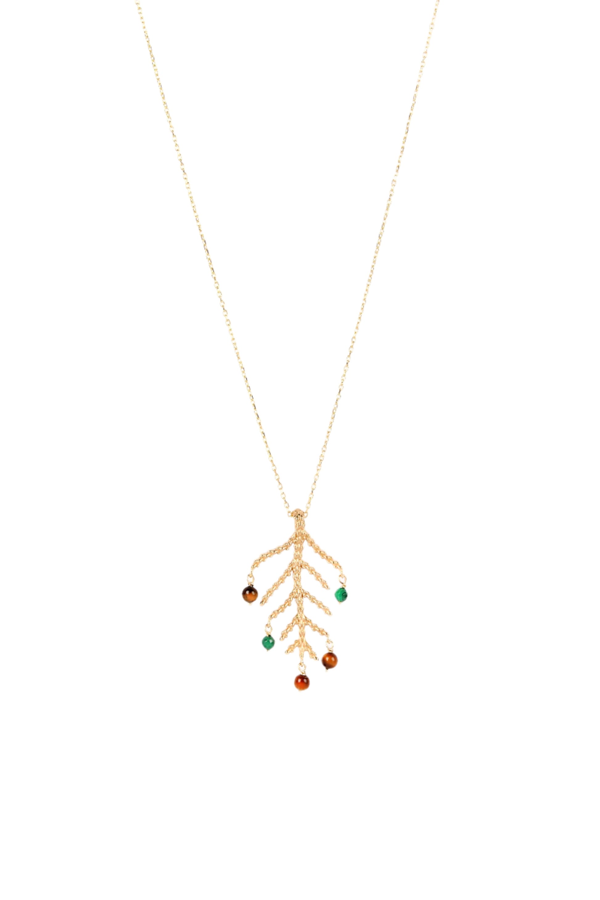 Shaped like a Cedar branch, this pendant radiates a sense of organic beauty. Its graceful silhouette is meticulously detailed, capturing the essence of nature's finest craftsmanship. The dangling and dancing emerald and tiger’s eye beads, reflect the beauty of the breeze through the Cedar's branches.