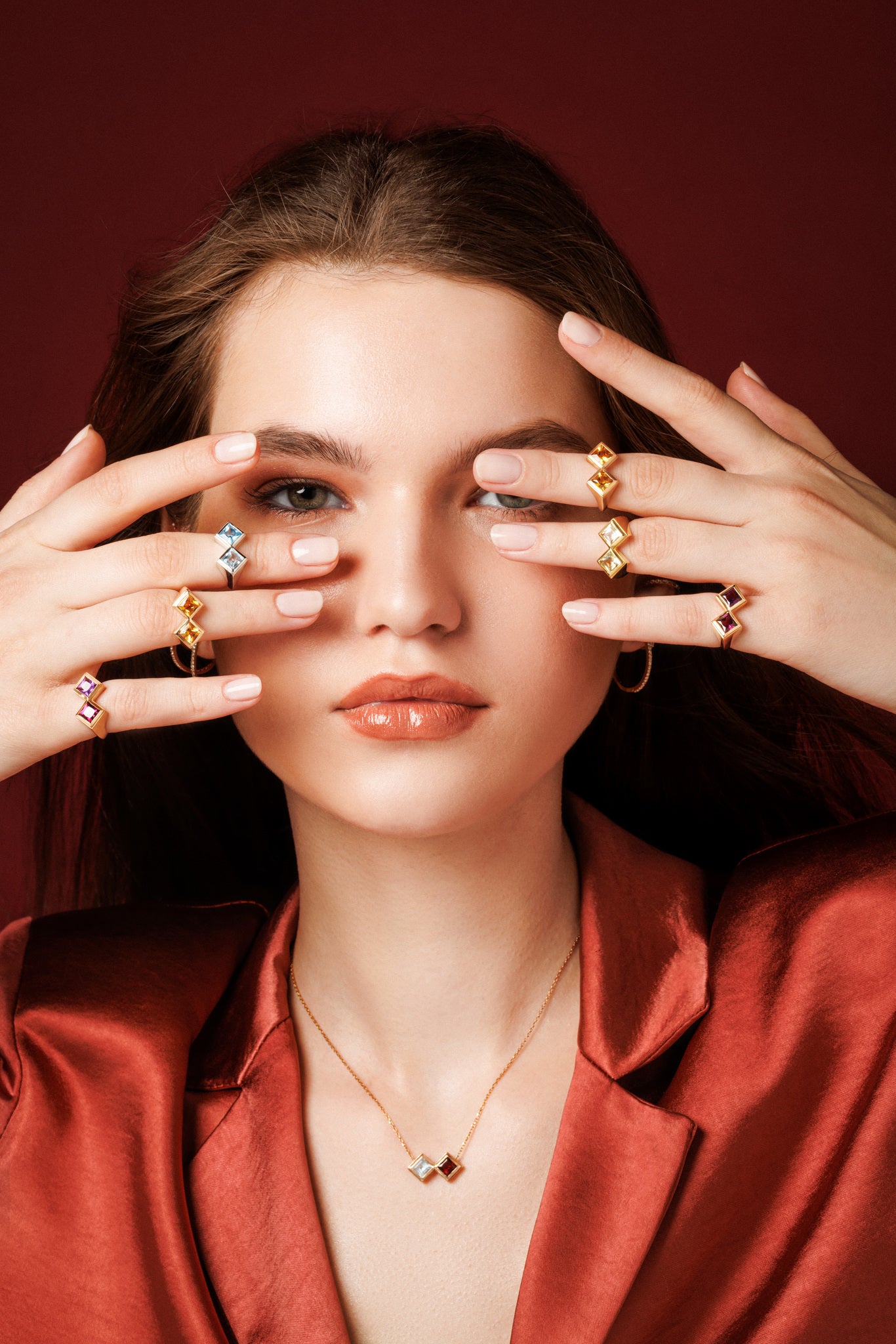 Square shaped purple rhodolite and amethyst